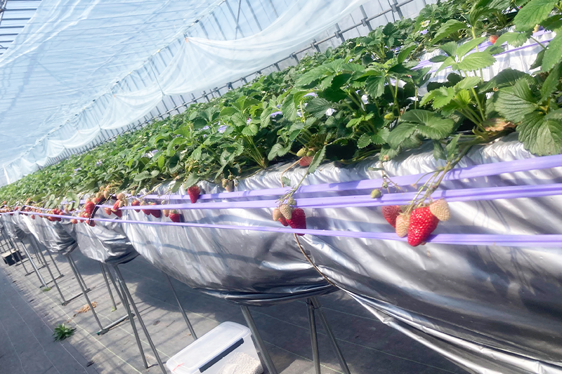 高設備栽培は、栽培量よりも快適さを。車椅子でも通れる通路を確保しているので老若男女問わずいちご狩りが楽しめます。