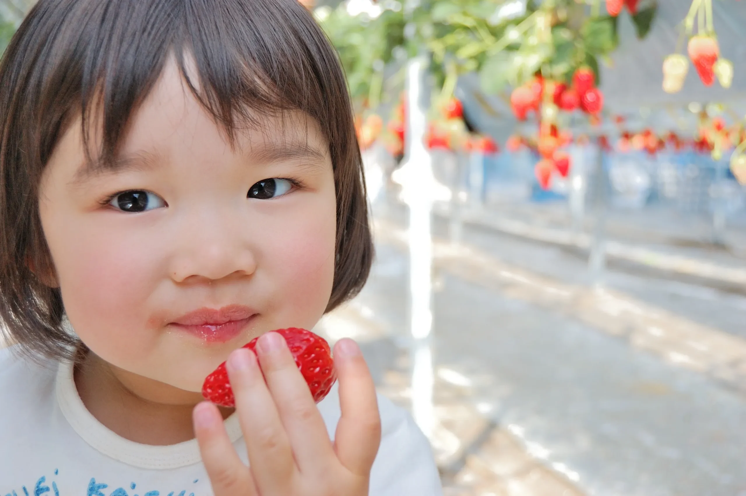 近年いちごの栽培は高設栽培という方法をとる農家さんが多くなっています。ですが、土の畝になるイチゴを是非わが子にも、自分で収穫する喜びを感じて欲しい、土に触れて欲しいという想いで、栽培方法を敢えて2種類行っています。